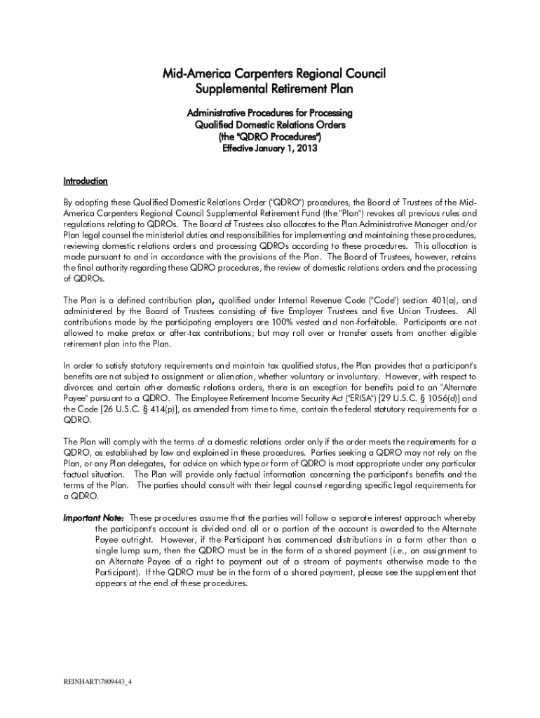 Mid-America Carpenters Regional Council Supplemental Retirement Plan Administrative Procedures for Processing Qualified Domestic Relations Orders (the \” QDR Procedures\”) Effective January 1,