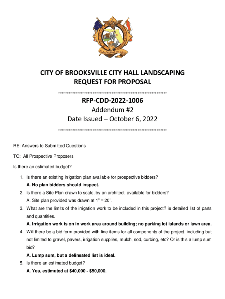 CITY OF BROOKVILLE CITY HALL LANDSCAPING REQUEST FOR PROPOSAL ***************************************************************RFPCDD20221006 Addendum #2 Date Issued October 6, 2022 ***************************************************************RE: