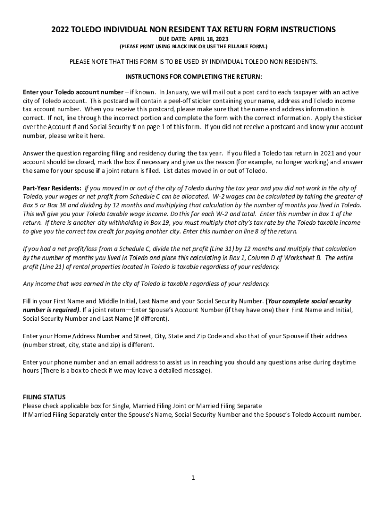2022 TOLEDO INDIVIDUAL NON-RESIDENT TAX RETURN FORM INSTRUCTIONS DUE DATE: APRIL 18, 2023(PLEASE PRINT USING BLACK INK OR USE THE FILLABLE FORM.)PLEASE NOTE THAT THIS FORM IS TO BE USED BY INDIVIDUAL