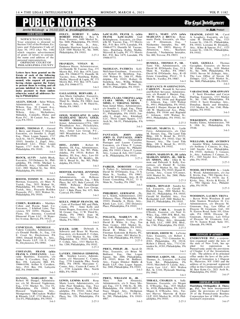 1 4 THE LEGAL L INTELLIGENCERMON DAY, MA R C H 6, 2 0 2 3VOL P. 1182PUBLIC NOTICES Jennifer McCullough215.557.2321ESTATE NOTICESNOTICE TO COUNSEL Your attention is directed to Section 3162 of the