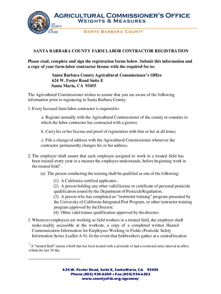 SANTA BARBARA COUNTY FARM LABOR CONTRACTOR REGISTRATION Please read, complete and sign the registration forms below. Submit this information and a copy of your farm labor contractor license with the