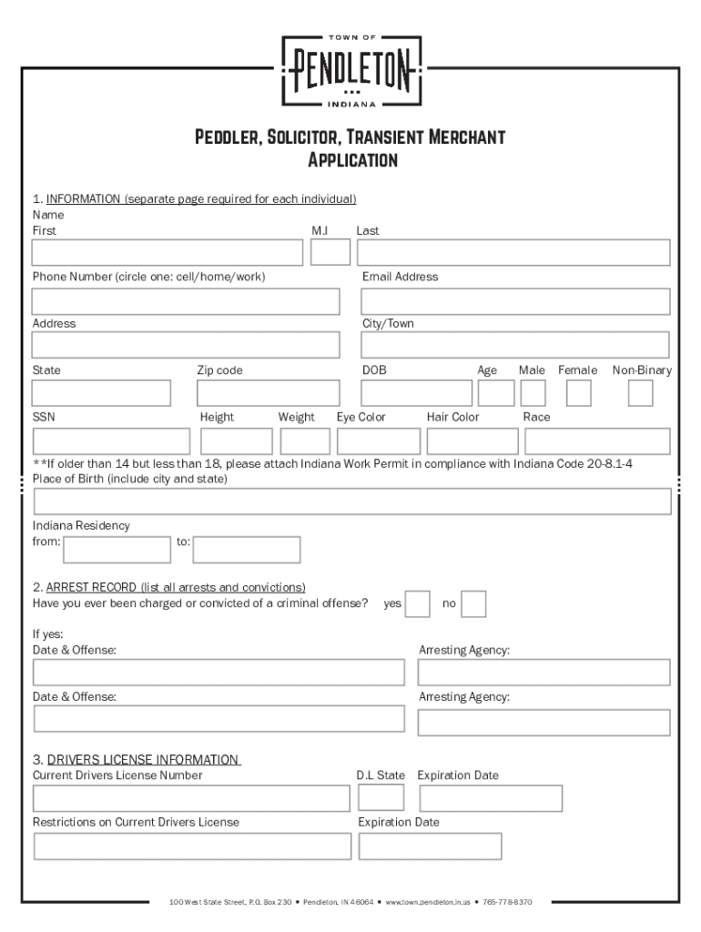 Peddler, Solicitor, Transient Merchant Application 1. INFORMATION (separate page required for each individual) Name First. If Last Phone Number (circle one: cell/home/work)Email AddressAddressCity/Town