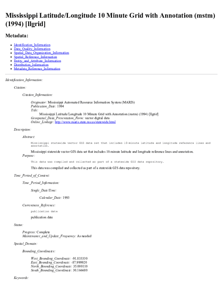 Mississippi Latitude/Longitude 10 Minute Grid with Annotation (MST) (1994) [ll grid] Metadata: Identification_Information Data_Quality_Information Spatial_Data_Organization_Information Spatial_Reference_Information