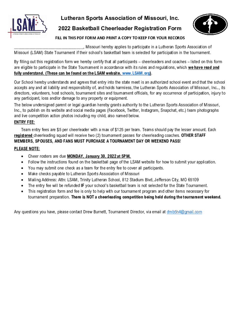 Lutheran Sports Association of Missouri, Inc. 2022 Basketball Cheerleader Registration Form FILL IN THIS PDF FORM AND PRINT A COPY TO KEEP FOR YOUR RECORDS ___, Missouri hereby applies to participate