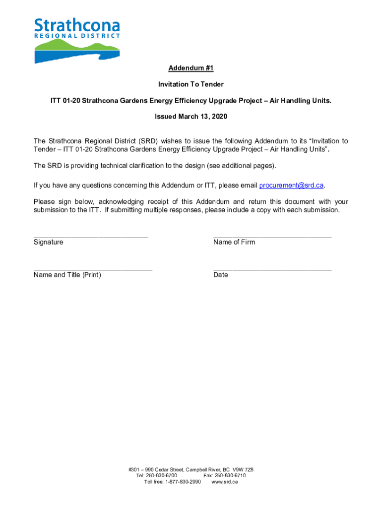 Addendum #1 Invitation To Tender ITT 0120 Stratton Gardens Energy Efficiency Upgrade Project Air Handling Units. Issued March 13, 2020, The Stratton Regional District (SRD) wishes to issue the following