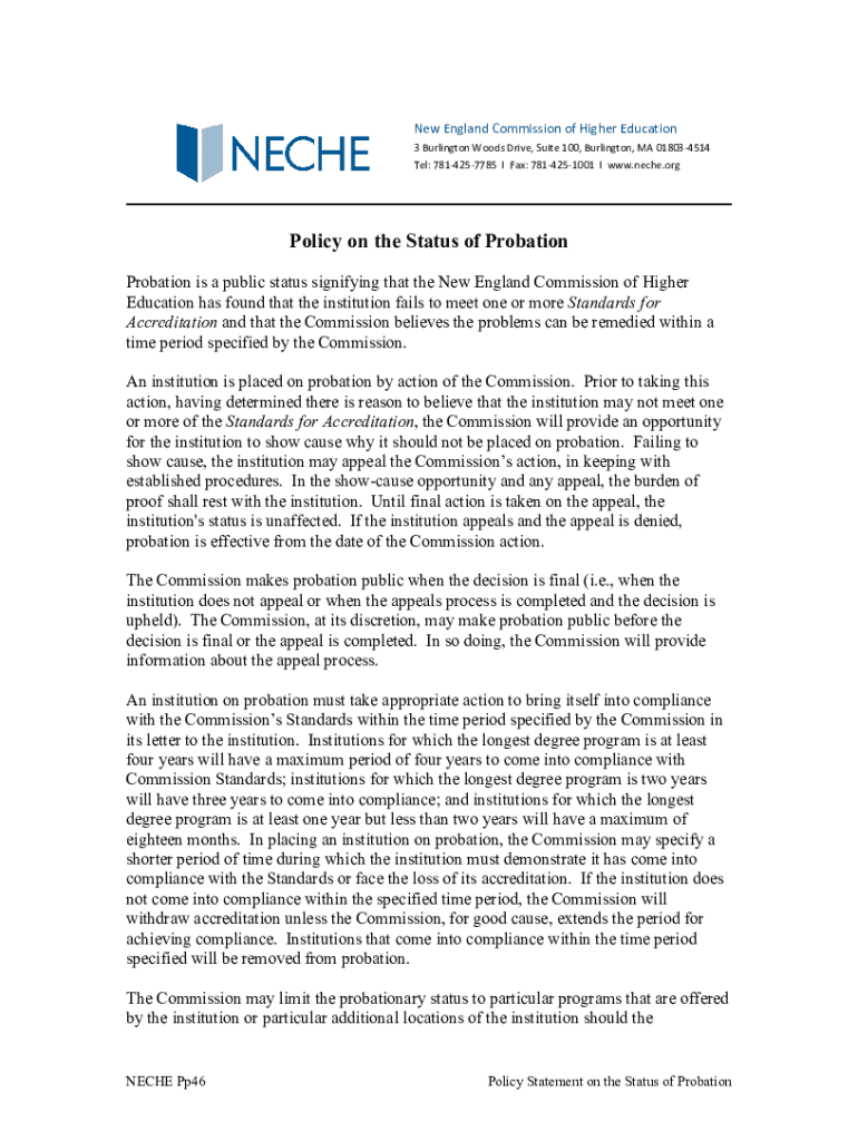 New England Commission of Higher Education 3 Burlington Woods Drive, Suite 100, Burlington, MA 018034514 Tel: 7814257785 I Fax: 7814251001 I www.neche.orgPolicy on the Status of Probation is a public