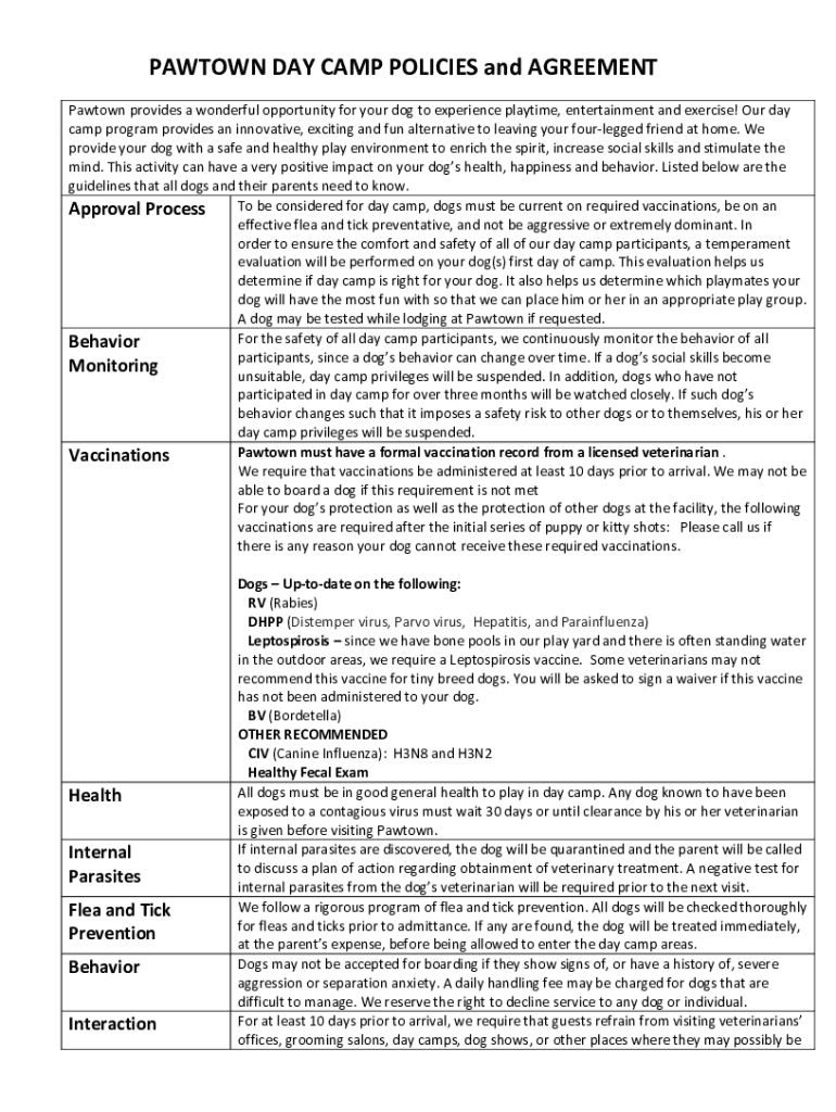 PATTON DAY CAMP POLICIES and AGREEMENT Paw town provides a wonderful opportunity for your dog to experience playtime, entertainment and exercise! Our day camp program provides an innovative, exciting