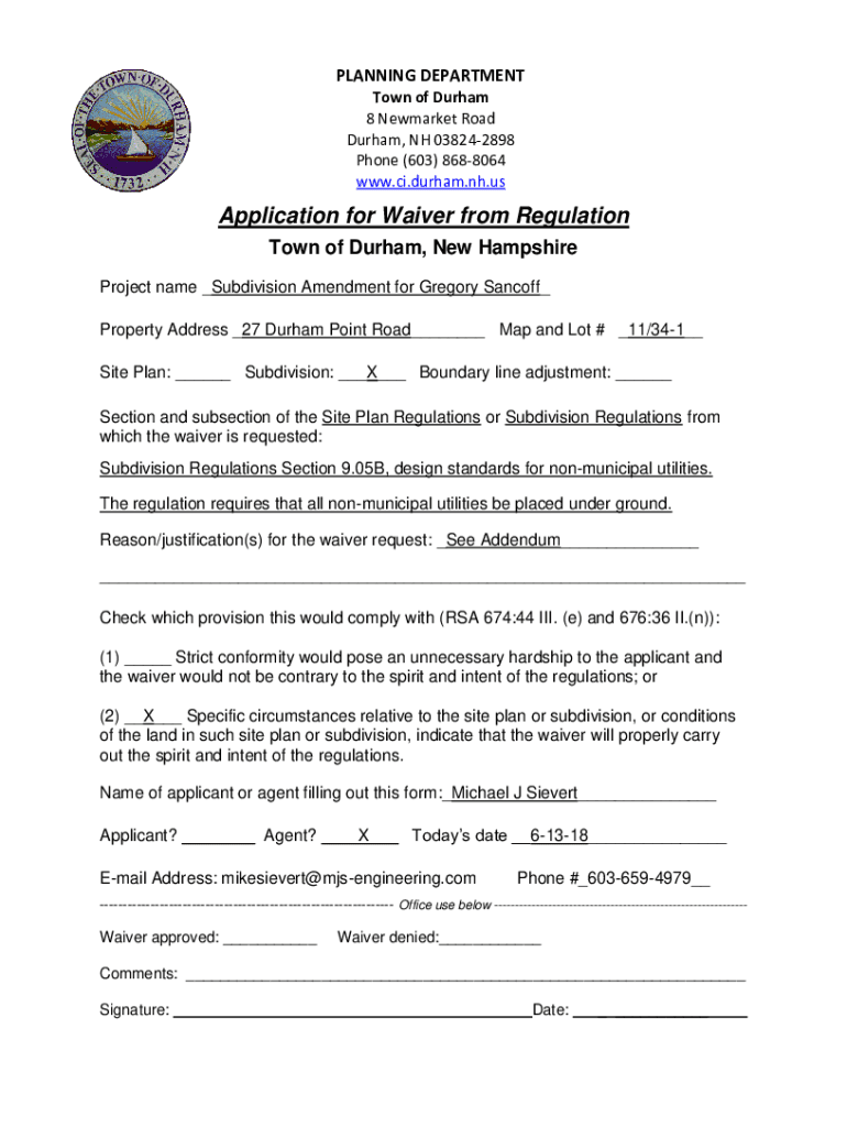 PLANNING DEPARTMENT Town of Durham 8 Newmarket Road Durham, NH 038242898 Phone (603) 8688064 www.ci.durham.nh.usApplication for Waiver from Regulation Town of Durham, New Hampshire Project name _Subdivision