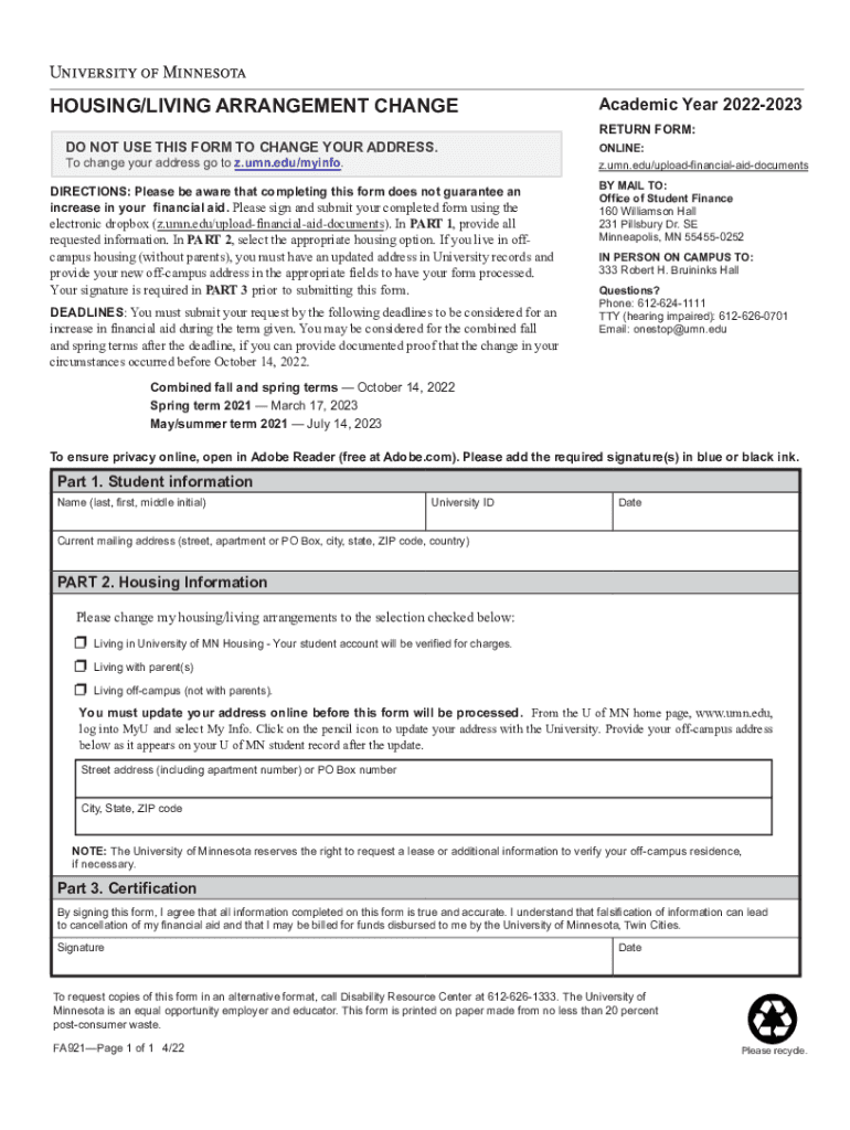 HOUSING/LIVING ARRANGEMENT CHANGE DO NOT USE THIS FORM TO CHANGE YOUR ADDRESS. To change your address go to z.umn.edu/myinfo. Academic Year 20222023 RETURN FORM: ONLINE: z.umn.edu/uploadfinancialaiddocumentsDIRECTIONS: