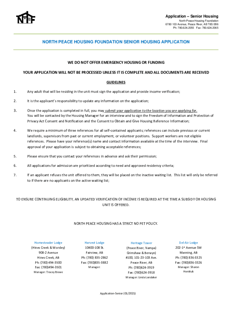 Application Senior Housing North Peace Housing Foundation 6780 103 Avenue, Peace River, AB T8S 0B6 pH: 780.624.2055 Fax: 780.624.2065NORTH PEACE HOUSING FOUNDATION SENIOR HOUSING APPLICATION DO NOT