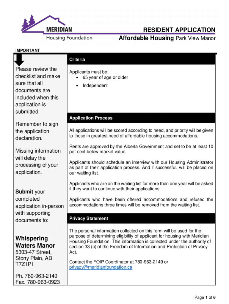 RESIDENT APPLICATION Affordable Housing Park View Manor IMPORTANTCriteriaPlease review the checklist and make sure that all documents are included when this application is submitted. Applicants must