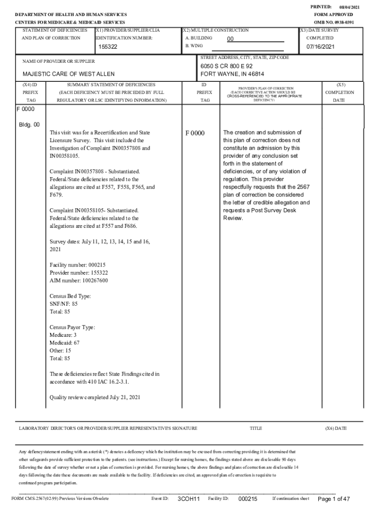 PRINTED: DEPARTMENT OF HEALTH AND HUMAN SERVICES CENTERS FOR MEDICARE & MEDICAID SERVICES STATEMENT OF DEFICIENCIES(X1) PROVIDER/SUPPLIER/LIGAND PLAN OF CORRECTIONIDENTIFICATION NUMBER:15532208/04/2021FORM