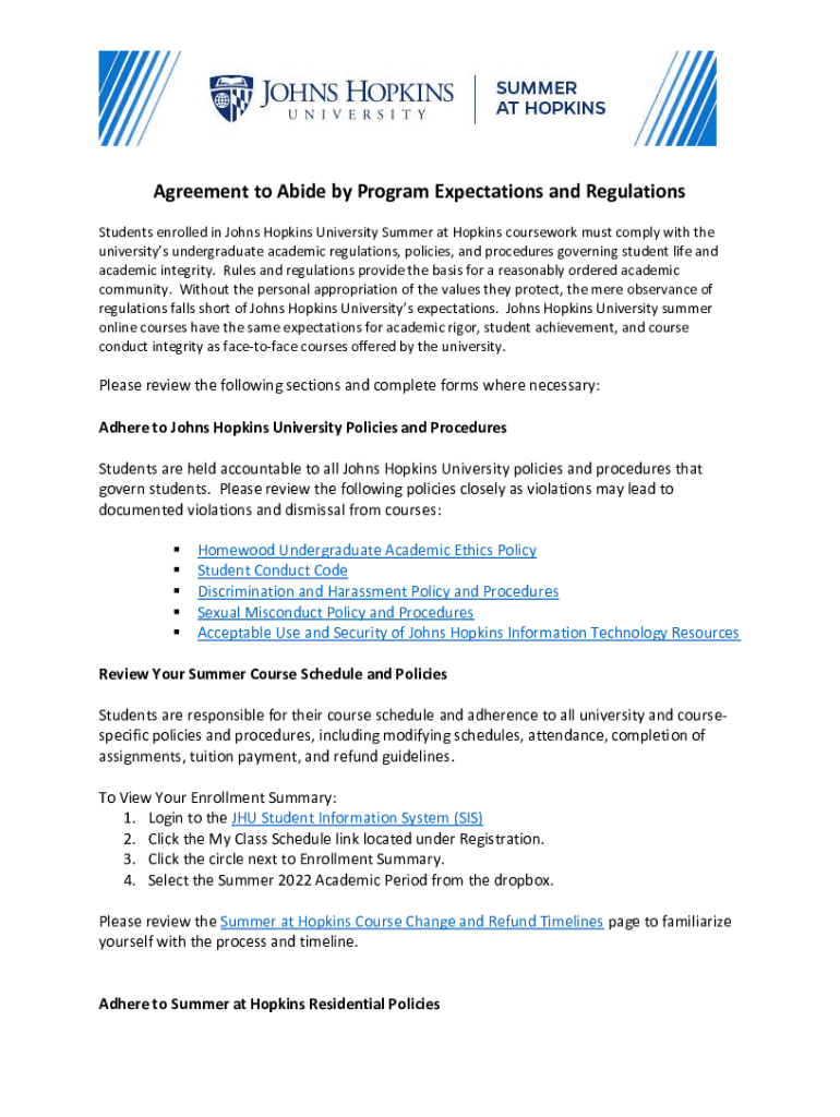 Agreement to Abide by Program Expectations and Regulations Students enrolled in Johns Hopkins University Summer at Hopkins coursework must comply with the universities undergraduate academic regulations,