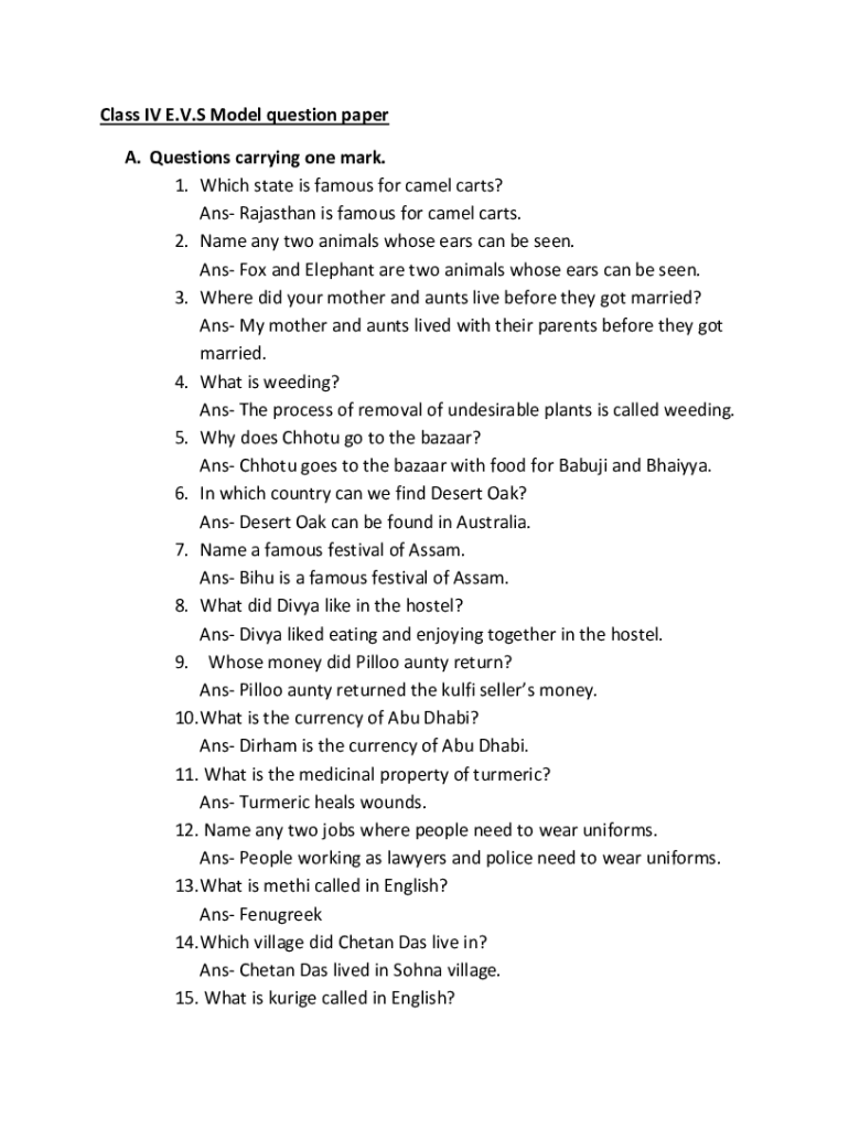 Get the free Class IV E.V.S Model question paper A. Questions carrying one ...