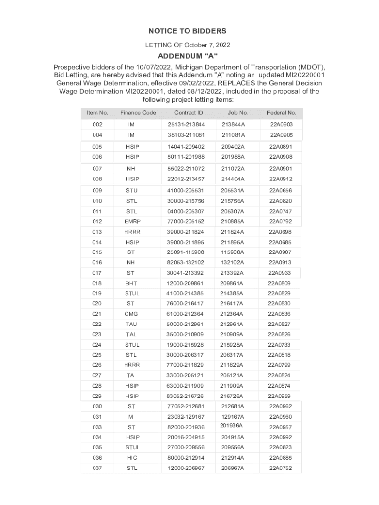 NOTICE TO BIDDERS LETTING OF October 7, 2022ADDENDUM \” A\” Prospective bidders of the 10/07/2022, Michigan Department of Transportation (DOT), Bid Letting, are hereby advised that this Addendum