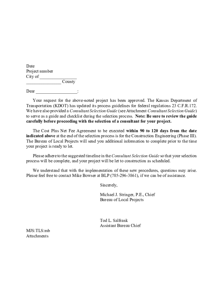 Date Project number City of ___ ___ County Dear ___: Your request for the above noted project has been approved. The Kansas Department of Transportation (DOT) has updated its process guidelines for