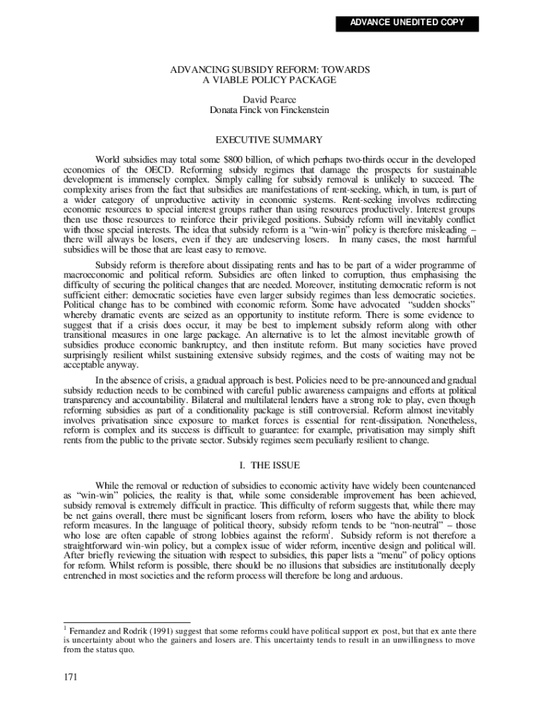 ADVANCE UNEDITED COPYADVANCING SUBSIDY REFORM: TOWARDS A VIABLE POLICY PACKAGE David Pearce Donate Finch on Finkelstein EXECUTIVE SUMMARY World subsidies may total some $800 billion, of which perhaps
