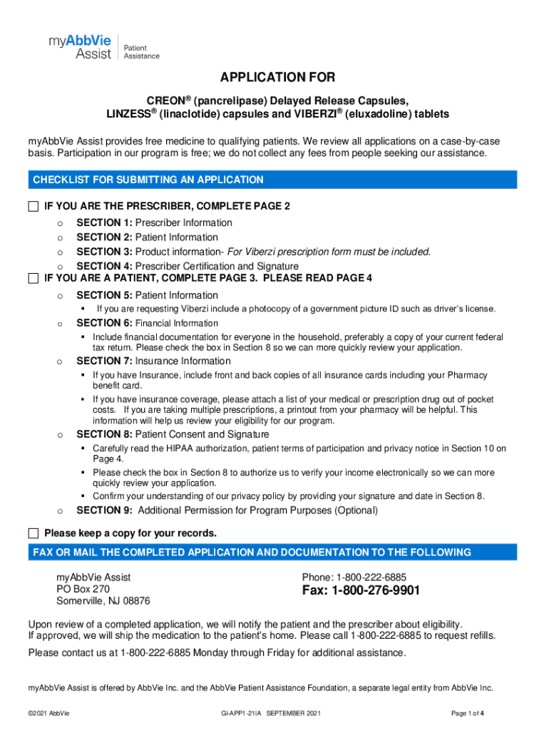 APPLICATION FOR () Delayed Release Capsules, LINES (dinucleotide) capsules and VIBER (eluxadoline) tablets Abbie Assist provides free medicine to qualifying patients. We review all applications on