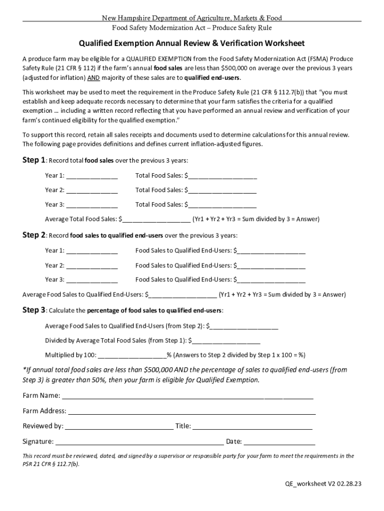 New Hampshire Department of Agriculture, Markets & Food Safety Modernization Act Produce Safety Unqualified Exemption Annual Review & Verification Worksheet A produce farm may be eligible for a QUALIFIED