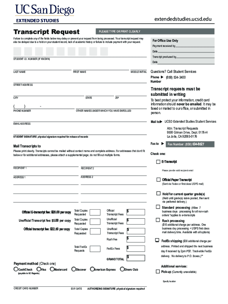 Extended studies.UCSD.transcript RequestPLEASE TYPE OR PRINT CLEARLYFailure to complete any of the fields below may delay or prevent your request from being processed. Your transcript request may
