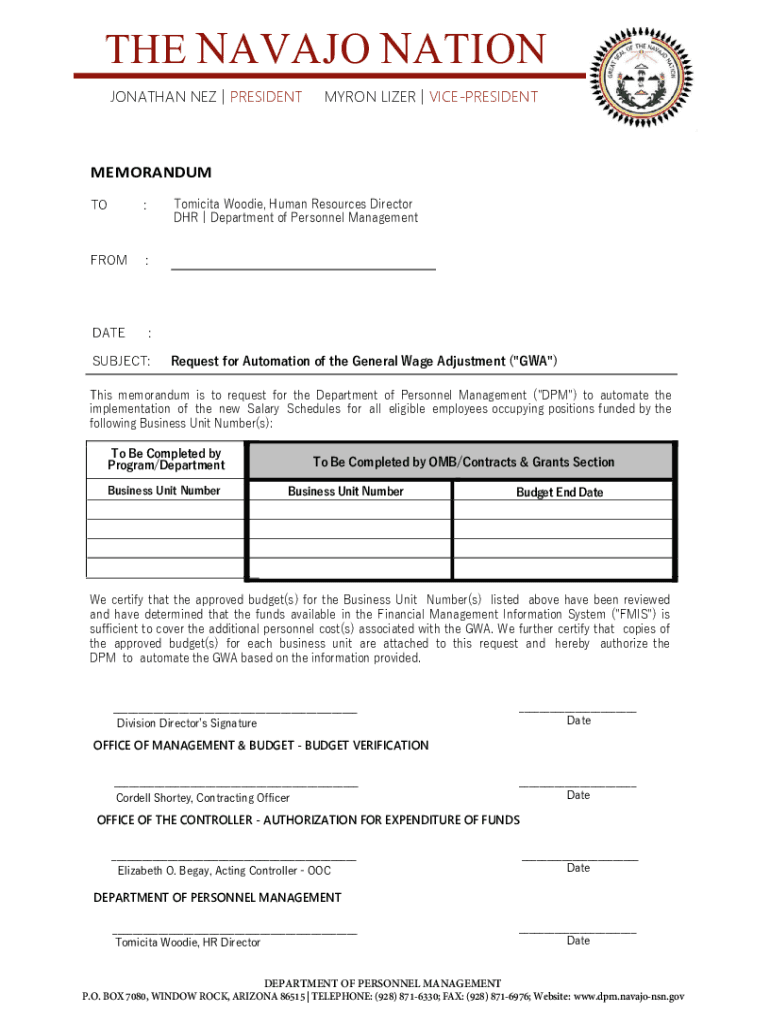 THE NAVAJO NATION JONATHAN NEW | PRESIDENTMYRON LINER | VICEPRESIDENTMEMORANDUM Toxicity Hoodie, Human Resources Director DHR | Department of Personnel Management TO:FROM:DATE:SUBJECT:Request for
