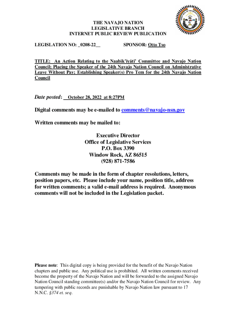 Get the free Bill would put Navajo legislative leader on indefinite leave