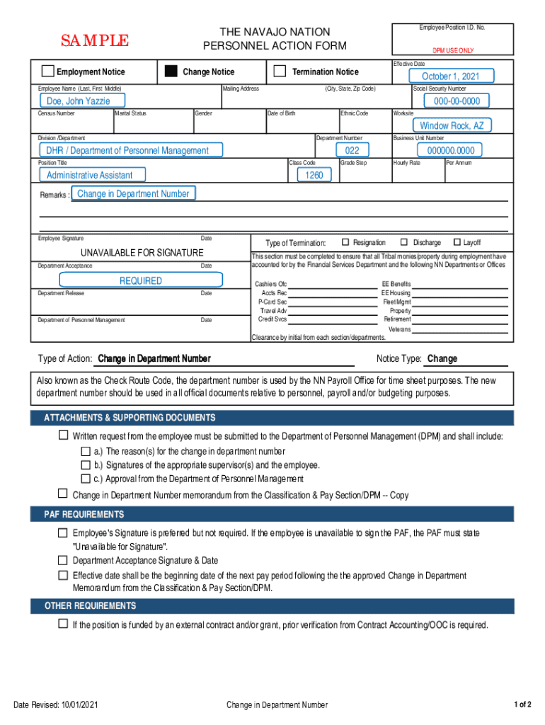 SAMPLE Employment NoticeChange NoticeEmployee Name (Last, First Middle)Effective Date October 1, 2021(City, State, Zip Code)Social Security Number. O. Box 0000; Window Rock, AZ. 86511 Marital StatusGenderSingle