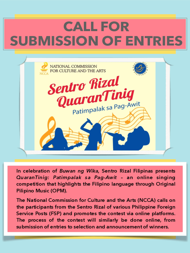CALL FOR SUBMISSION OF ENTRIES In celebration of By wan NG Wiki, Sentry Rizal Filipinas presents Quarantining: Patimpalak SA Again an online singing competition that highlights the Filipino language