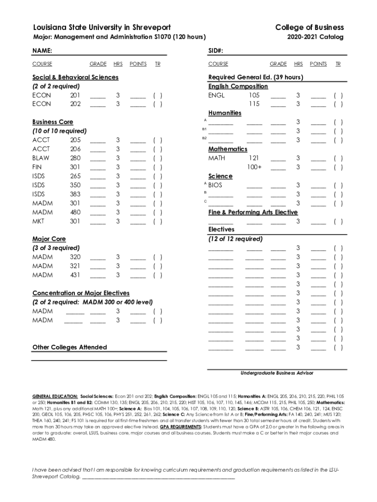 Louisiana State University in ShreveportCollege of Business Major: Management and Administration S1070 (120 hours) NAME: COURSE SID#: GRADEHRSSocial & Behavioral Sciences (2 of 2 required) ECON 201