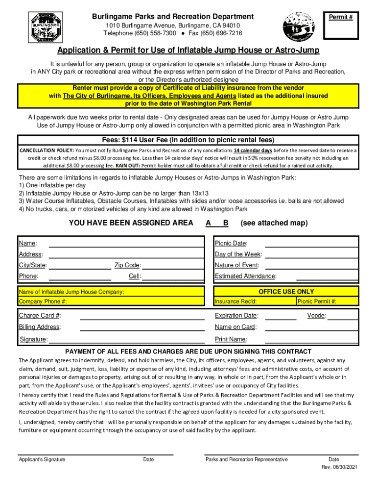 Telephone (650) 5587300 Fax (650) 6967216Application & Permit for Use of Inflatable Jump House or Astronomy