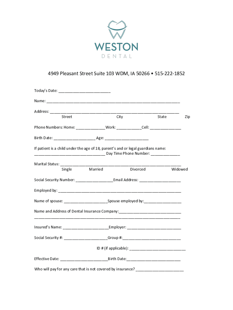 4949 Pleasant Street Suite 103 WDM, IA 50266 5152221852 Today's Date: ___ Name: ___ Address: ___ Street City StateZipPhone Numbers: Home: ___Work: ___Cell: ___ Birth Date: ___ Age: ___ If patient