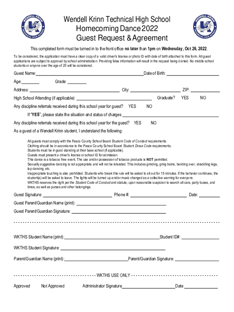 Wendell Kr inn Technical High School Homecoming Dance 2022 Guest Request & Agreement This completed form must be turned in to the front office no later than 1pm on Wednesday, Oct 26, 2022. To be considered,