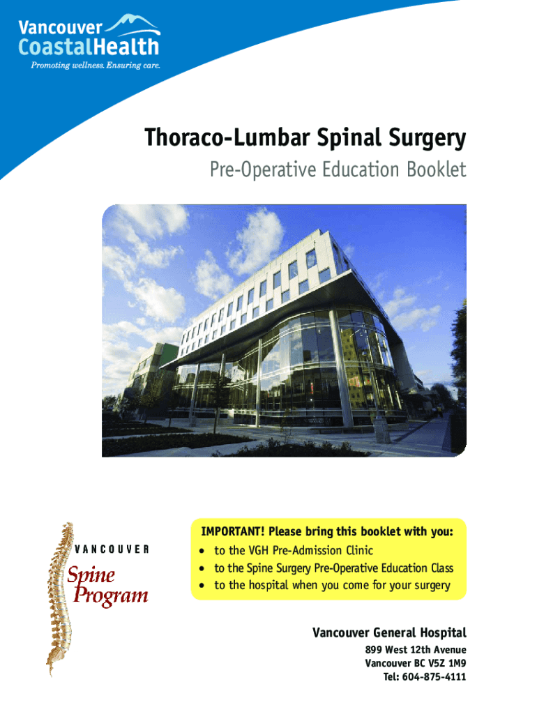 ThoracoLumbar Spinal Surgery Preoperative Education BookletIMPORTANT! Please bring this booklet with you: to the GH Readmission Clinic to the Spine Surgery Preoperative Education Class to the hospital
