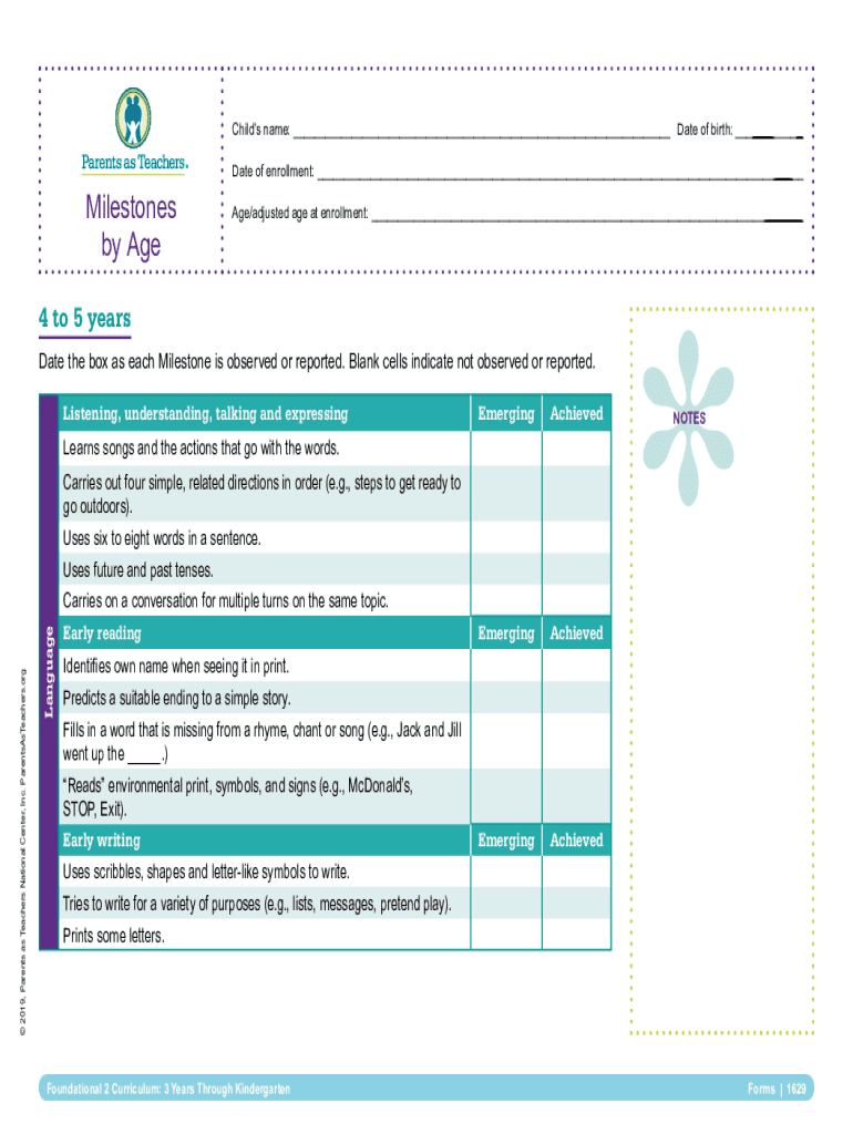 Child's name: ___ Date of birth: ___ ___ ___ __ Date of enrollment: ___ ___ __Milestones by Average/adjusted age at enrollment: ___ ___4 to 5 years Date the box as each Milestone is observed or reported.