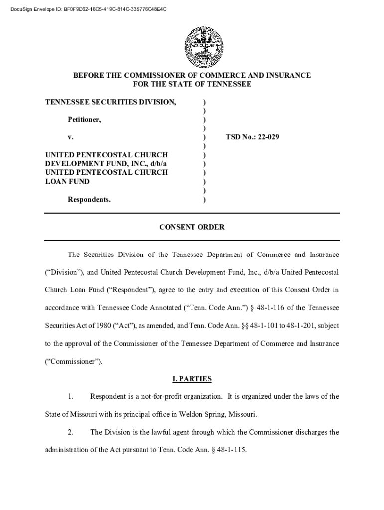 DocuSign Envelope ID: BF0F9D6216C5419C814C335776C48E4CBEFORE THE COMMISSIONER OF COMMERCE AND INSURANCE FOR THE STATE OF TENNESSEE SECURITIES DIVISION, Petitioner, v. UNITED PENTECOSTAL CHURCH DEVELOPMENT