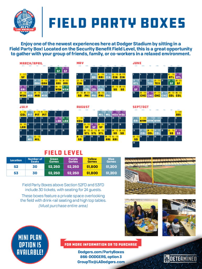 FIELD PARTY BOXES Enjoy one of the newest experiences here at Dodger Stadium by sitting in a Field Party Box! Located on the Security Benefit Field Level, this is a great opportunity to gather with
