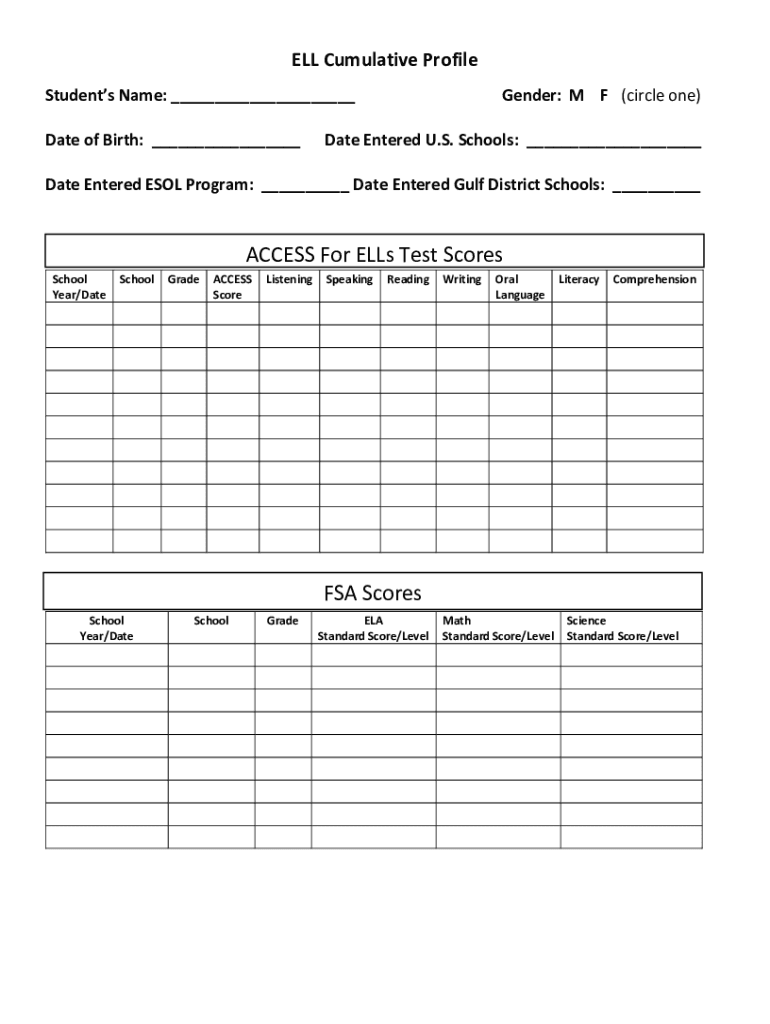ELL Cumulative Profile Students Name: ___ Date of Birth: ___Gender: M F (circle one)Date Entered U.S. Schools: ___Date Entered ESOL Program: ___ Date Entered Gulf District Schools: ___ACCESS For Ells