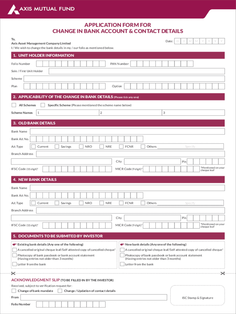 APPLICATION FORM FOR CHANGE IN BANK ACCOUNT & CONTACT DETAILS To, Axis Asset Management Company Limited I / We wish to change the bank details in my / our folio as mentioned below. Date:DDMMYYYY1.