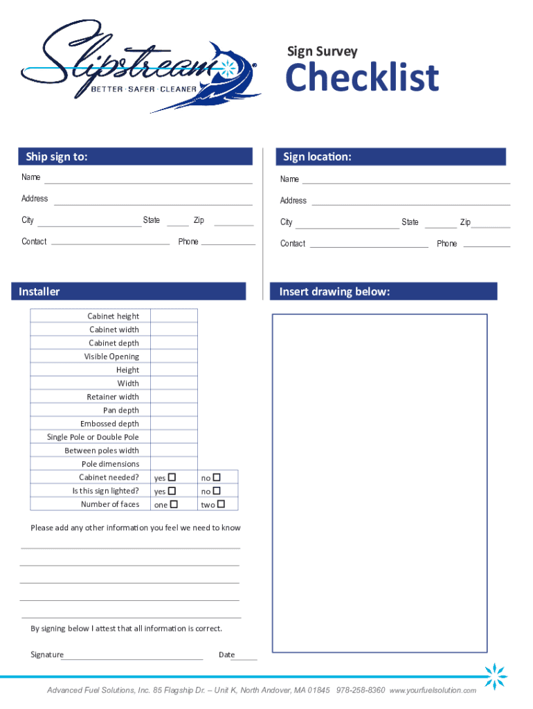 Sign SurveyChecklist Ship sign to:Sign location:NameNameAddressAddressCityStateContactZipCityPhoneContactZip PhoneInsert drawing below:Installer Cabinet height Cabinet width Cabinet depth Visible