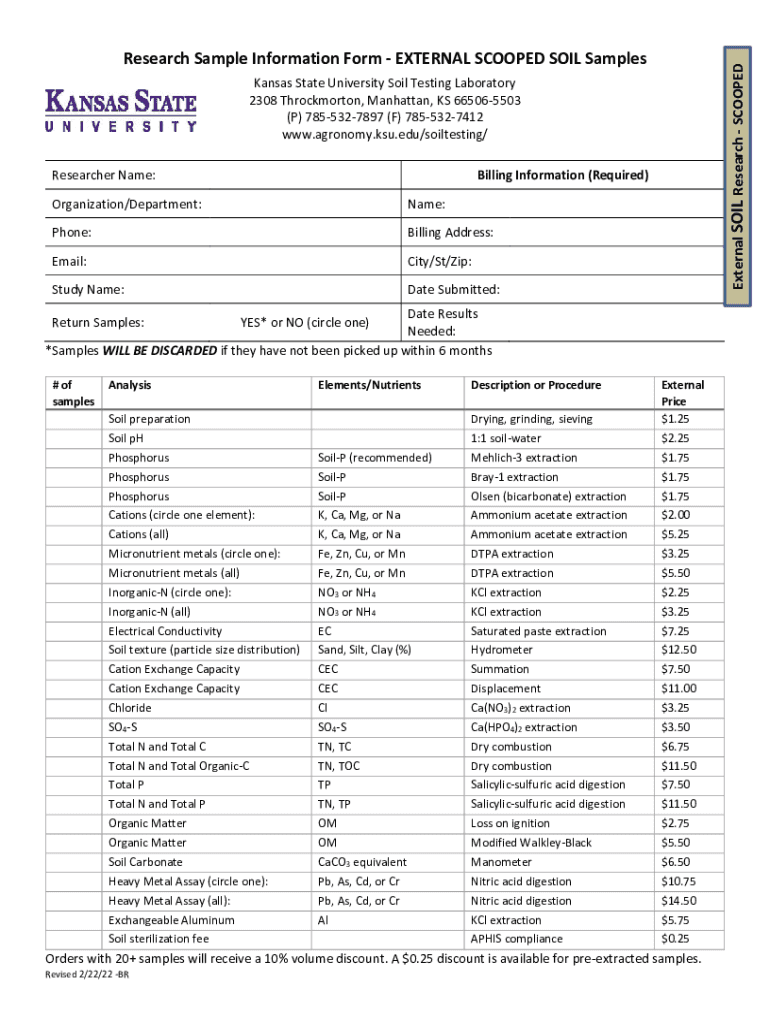 External SOIL Research SCOOPEDResearch Sample Information Form EXTERNAL SCOOPED SOIL Samples Kansas State University Soil Testing Laboratory 2308 Throckmorton, Manhattan, KS 665065503 (P) 7855327897