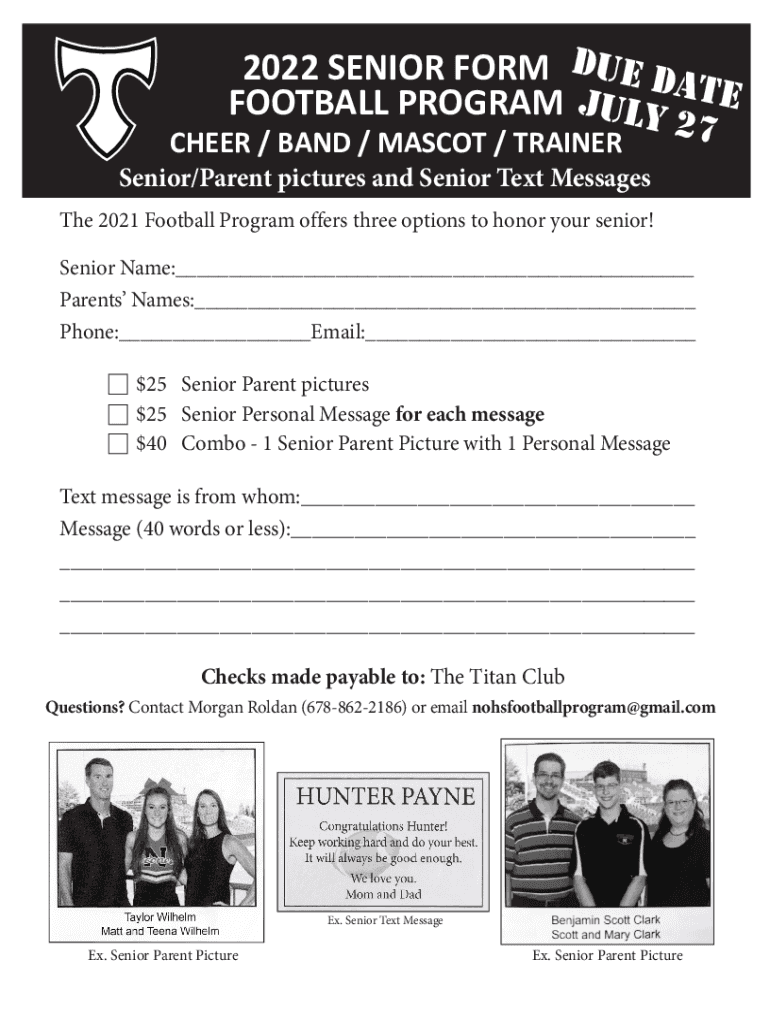 2022 SENIOR FORM due the FOOTBALL PROGRAM July the 27 CHEER / BAND / MASCOT / TRAINER Senior/Parent pictures and Senior Text Messages 2021 Football Program offers three options to honor your senior!