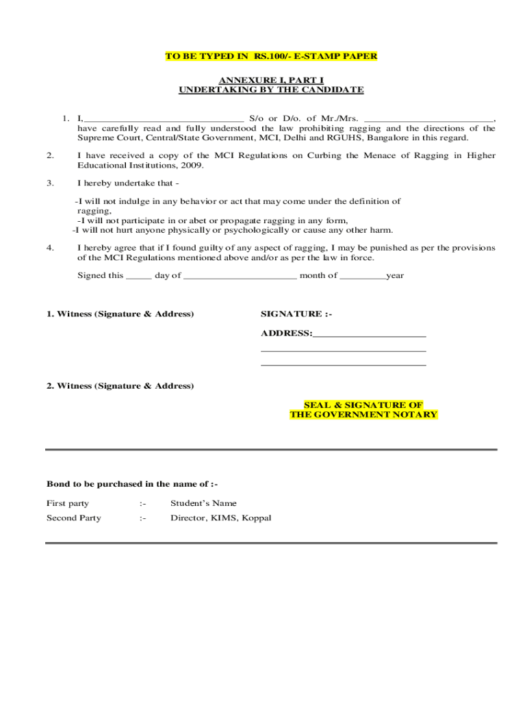 TO BE TYPED IN RS.100/ STAMP PAPER Appendix I, PART I UNDERTAKING BY THE CANDIDATE1. I, ___ S/o or D/o. of Mr./Mrs. ___, have carefully read and fully understood the law prohibiting ragging and the