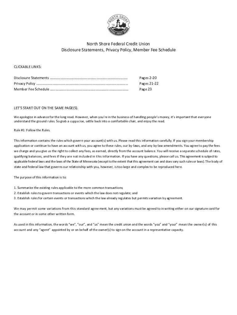 North Shore Federal Credit Union Disclosure Statements, Privacy Policy, Member Fee ScheduleCLICKABLE LINKS: Disclosure Statements ... Privacy Policy .... Member Fee Schedule. Pages 220 Pages 2122
