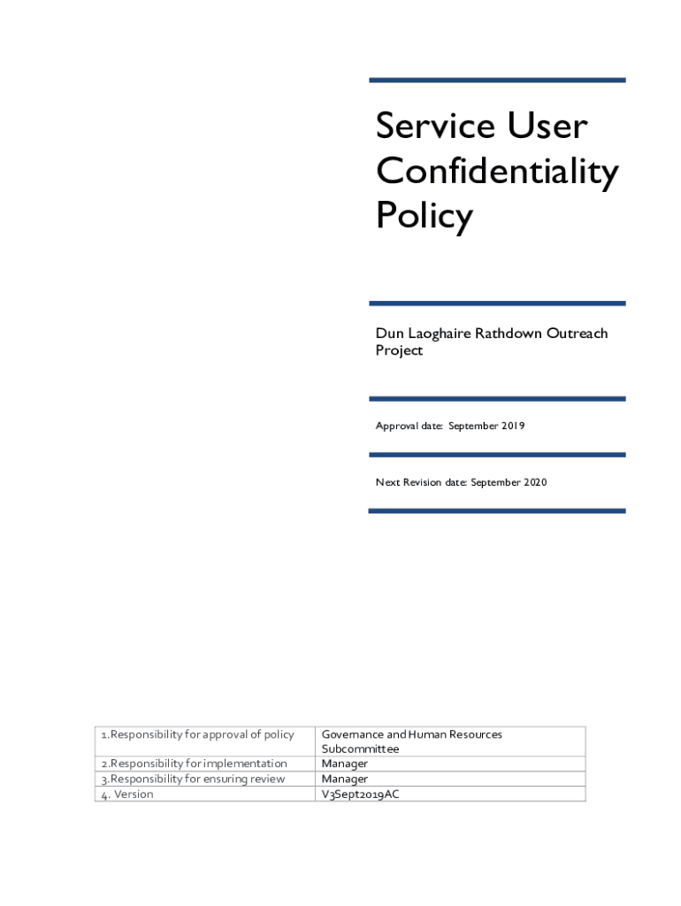 Service User Confidentiality Policy Dun Lawfare Thrown Outreach ProjectApproval date: September 2019Next Revision date: September 20201. Responsibility for approval of policy 2. Responsibility for