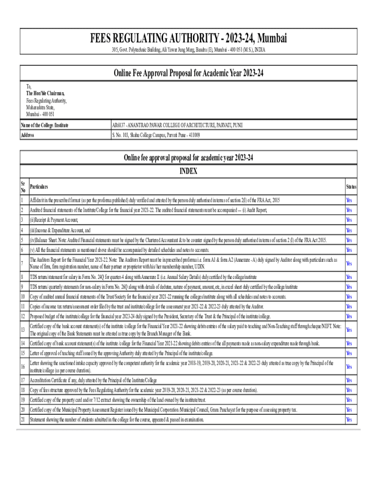 FEES REGULATING AUTHORITY 202324, Mumbai 305, Govt. Polytechnic Building, Ali Ya war Jung Mary, Sandra (E), Mumbai 400 051 (M.S.), Indianize Fee Approval Proposal for Academic Year 202324 To, The