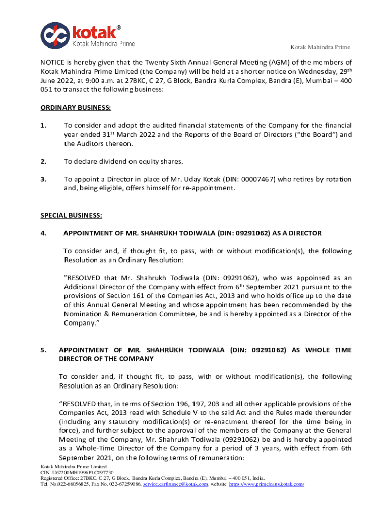 Kotak Mahindra Prentice is hereby given that the Twenty Sixth Annual General Meeting (AGM) of the members of Kotak Mahindra Prime Limited (the Company) will be held at a shorter notice on Wednesday,