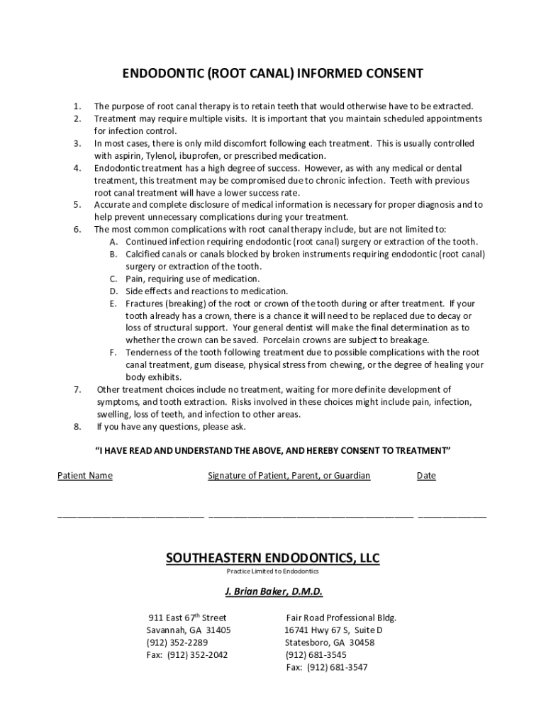 ENDODONTIC (ROOT CANAL) INFORMED CONSENT 1. 2. 3. 4.5. 6.7.8. The purpose of root canal therapy is to retain teeth that would otherwise have to be extracted. Treatment may require multiple visits.