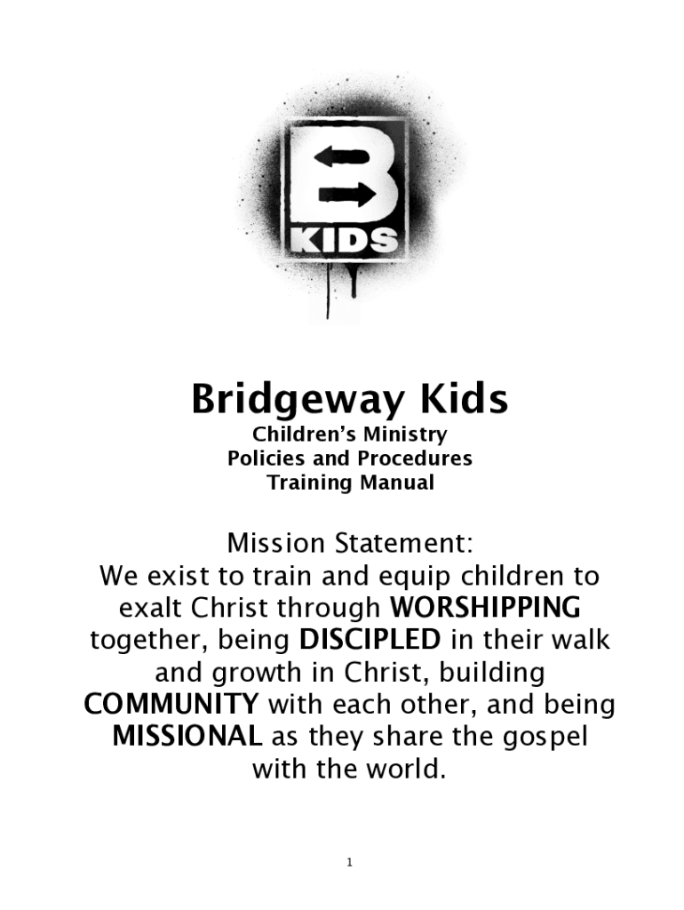 Bridleway Kids Children's Ministry Policies and Procedures Training Manumission Statement: We exist to train and equip children to exalt Christ through Worshiping together, being Disciple in their