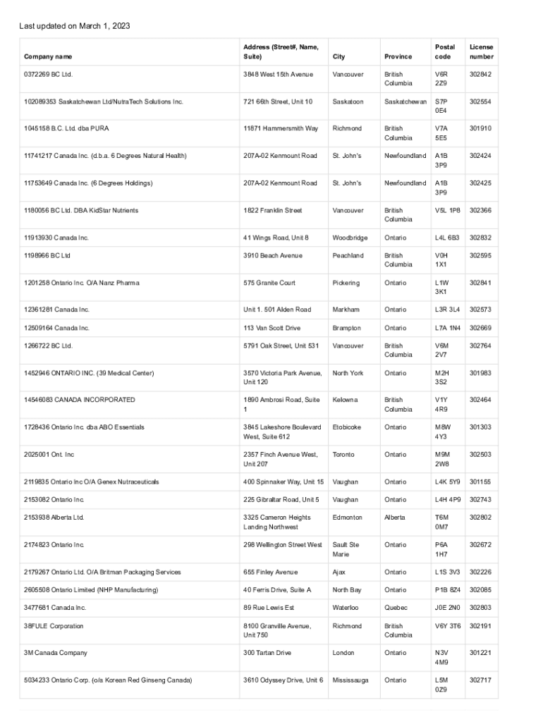 Last updated on March 1, 2023Company headdress (Street#, Name, Suite)CityProvincePostal codeLicense number0372269 BC Ltd.3848 West 15th AvenueVancouverBritish ColumbiaV6R 2Z9302842102089353 Saskatchewan