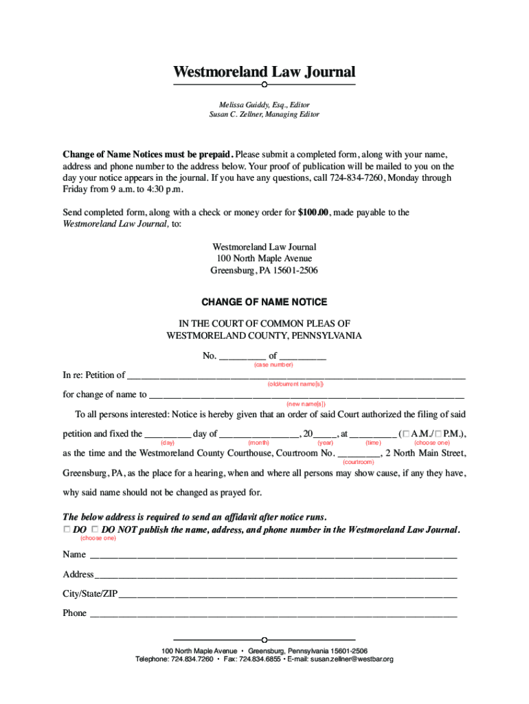 Westmoreland Law Journal Melissa Giddy, Esq., Editor Susan C. Seller, Managing EditorChange of Name Notices must be prepaid. Please submit a completed form, along with your name, address and phone
